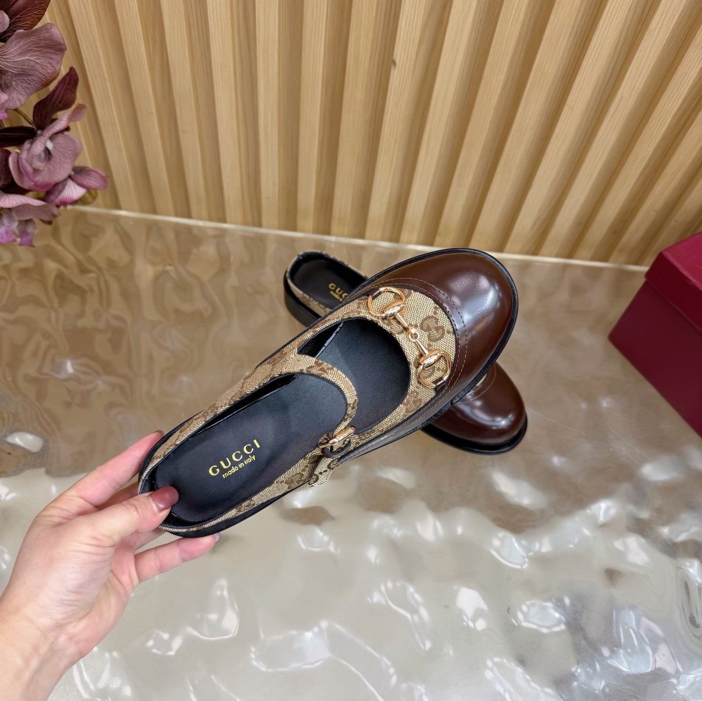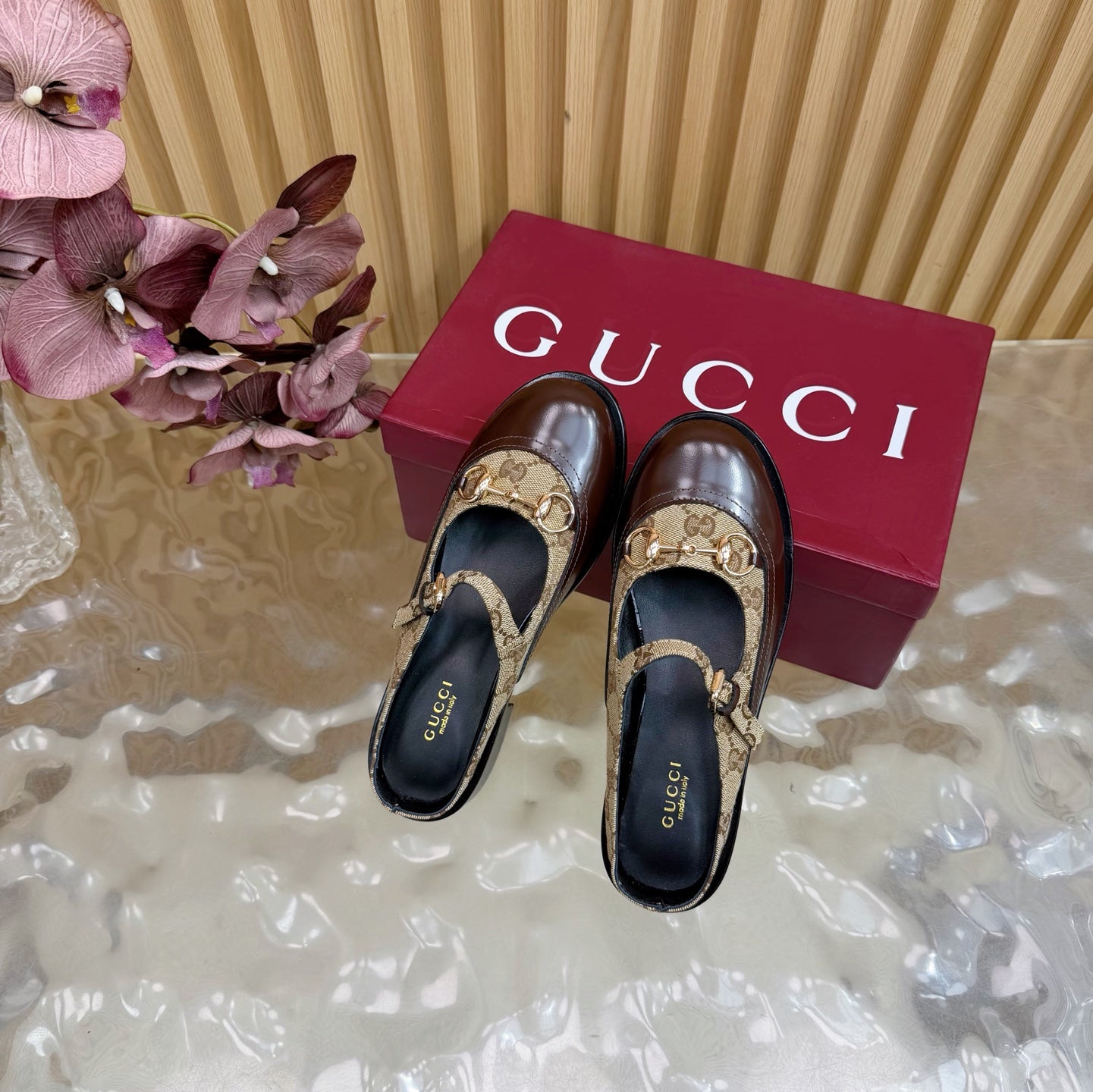 GG 26 Mule Brown Beige Beaded Leather Double G Fabric 589456