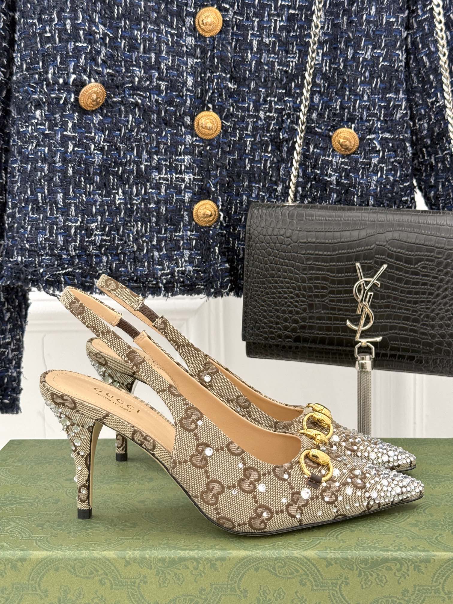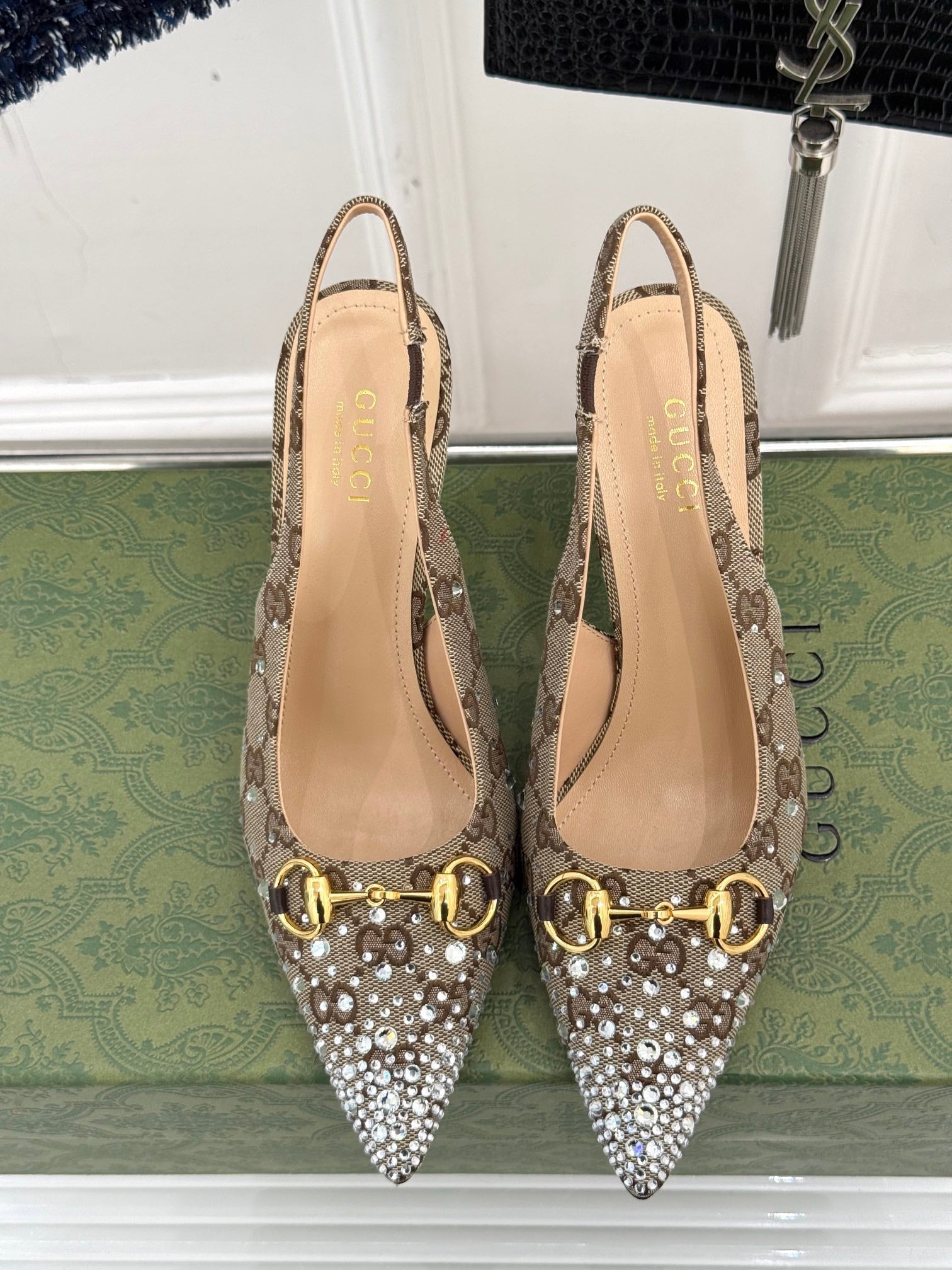 GG Horsebit Slingback 85MM Beige Ebony Monogram Canvas Point Toe Crystal-Embellished