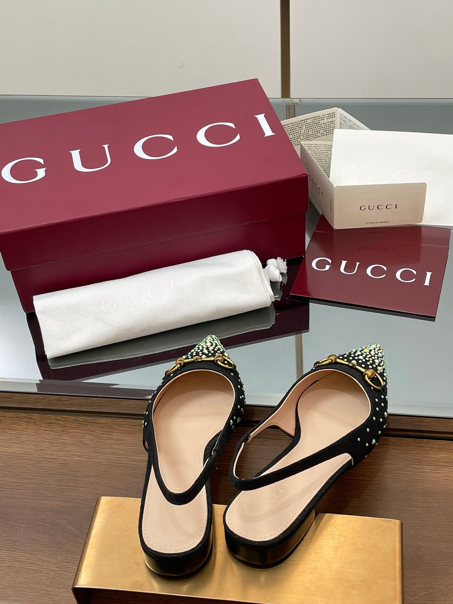 GG Horsebit Slingback Flat Black Ebony Monogram Canvas Point Toe Crystal-Embellished