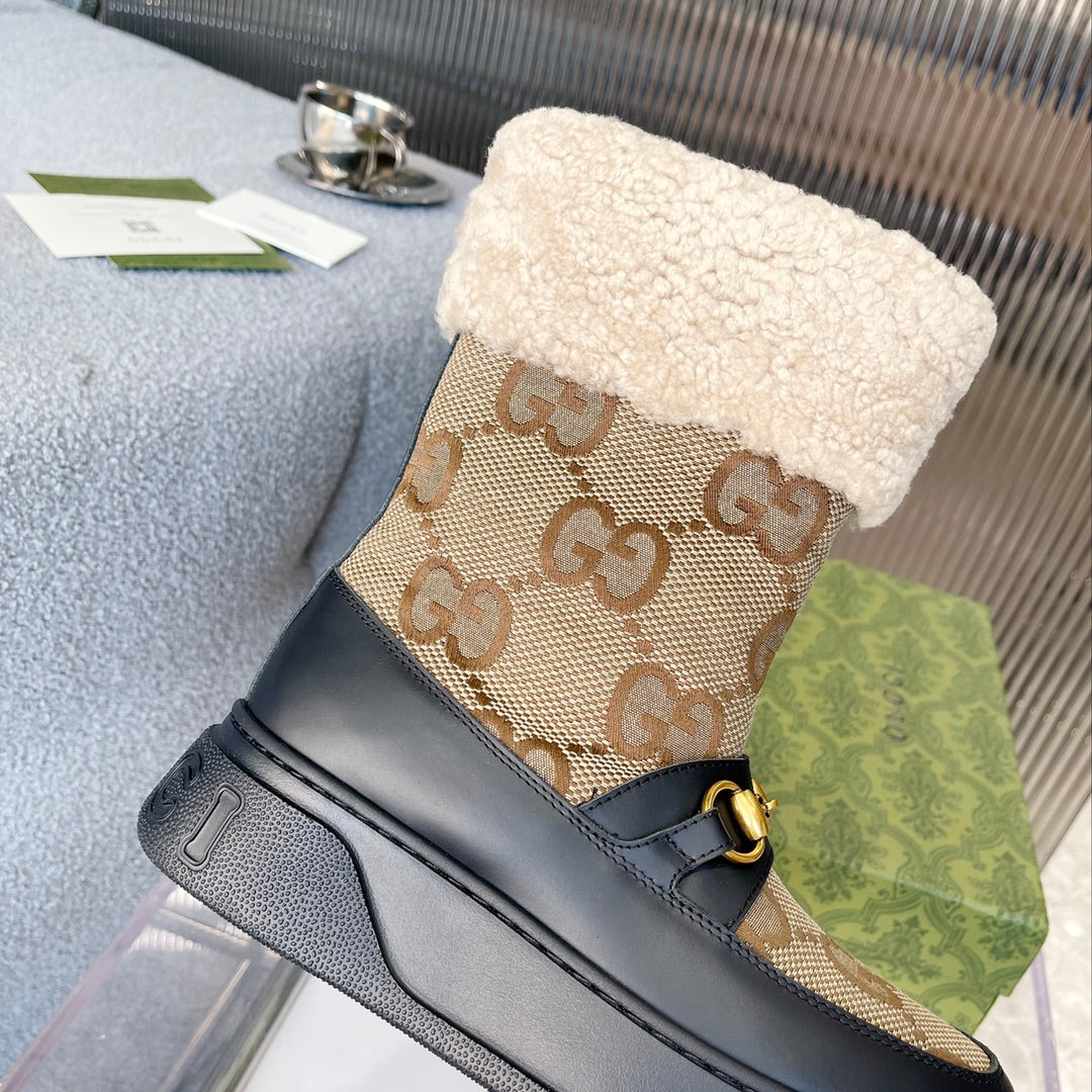 Gucci 2025 Monogram Boot Black Beige Wool Canvas Calfskin 564685