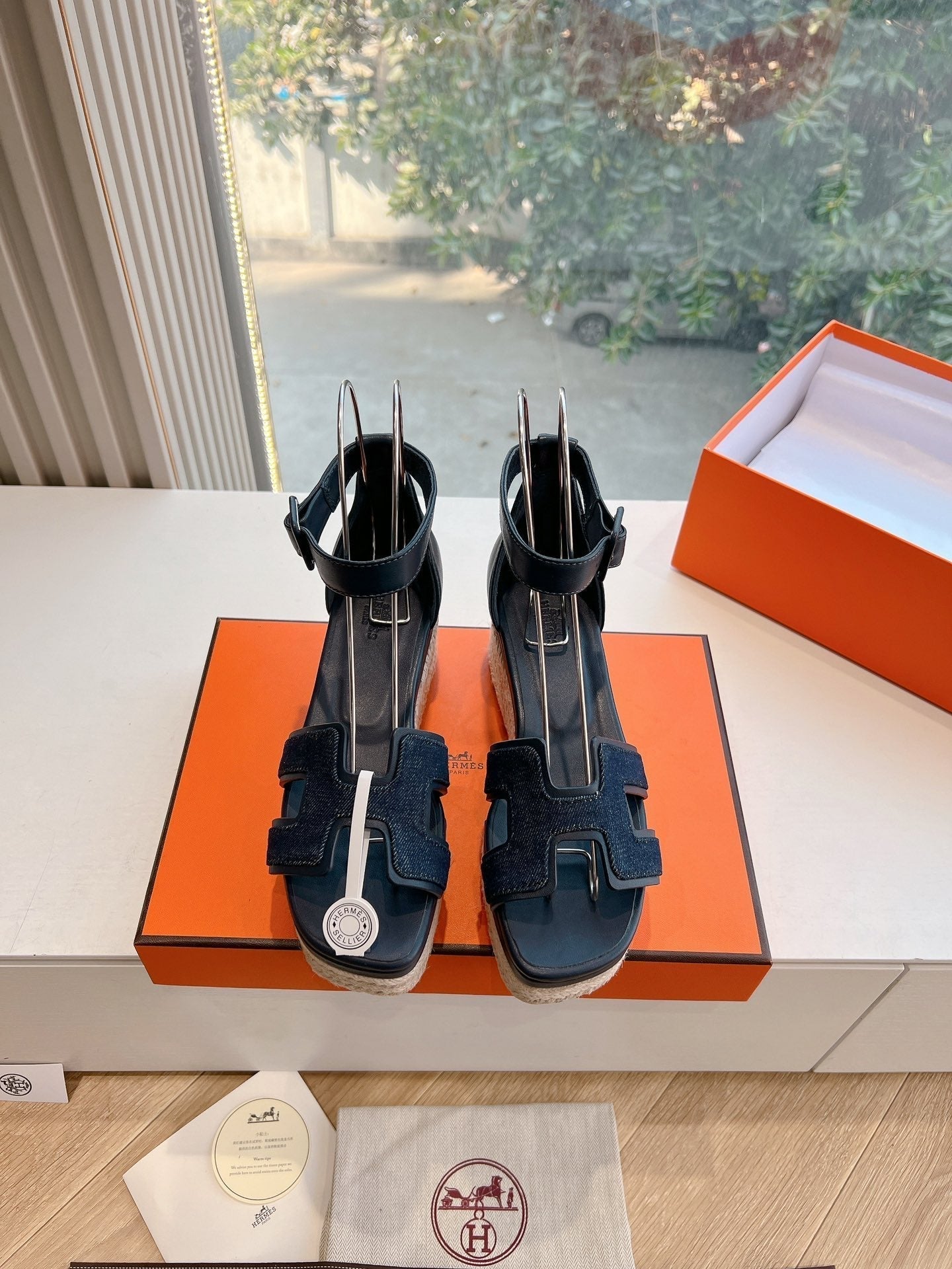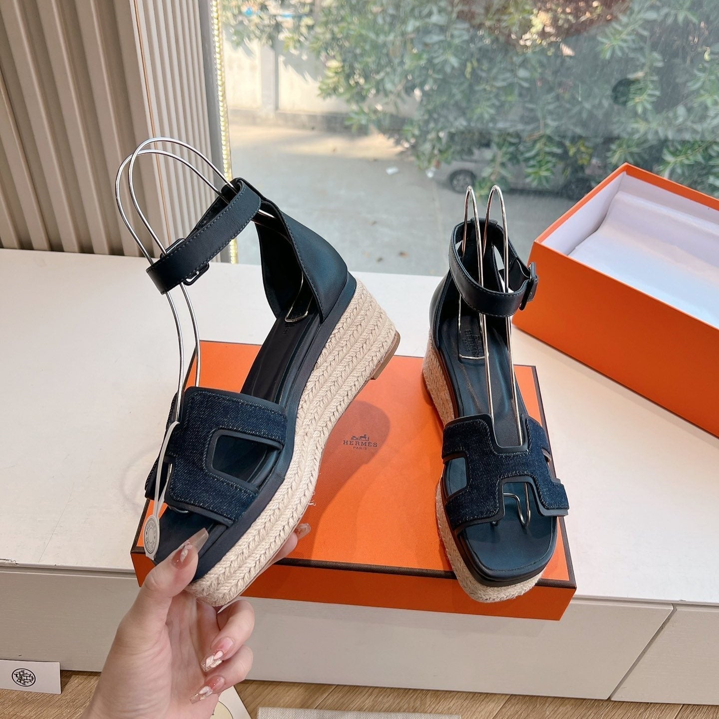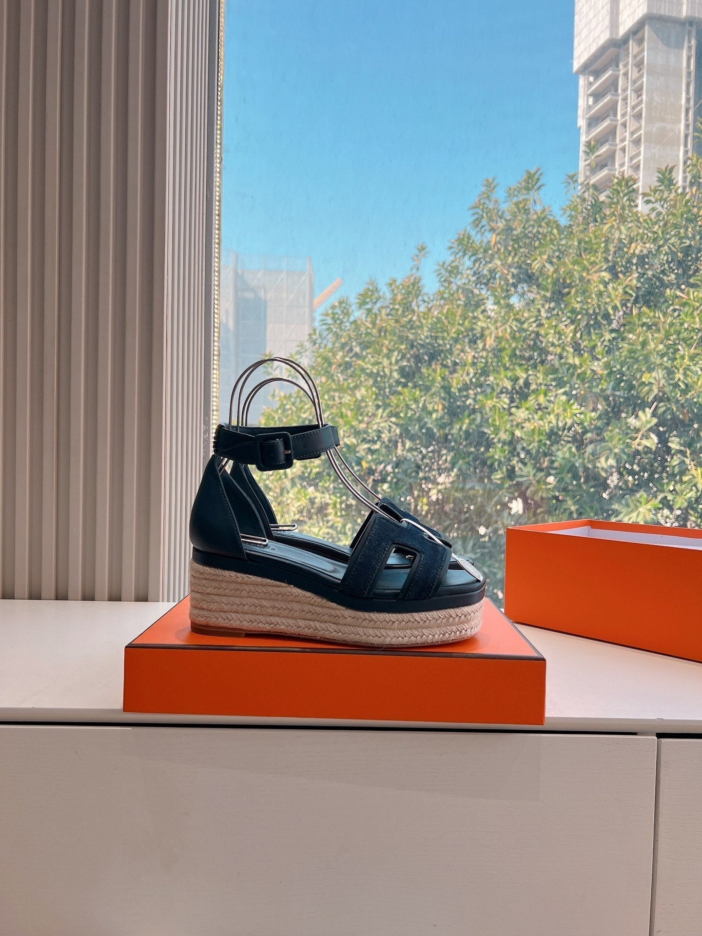 - Material: Denim and Goatskin, wedged rope heel