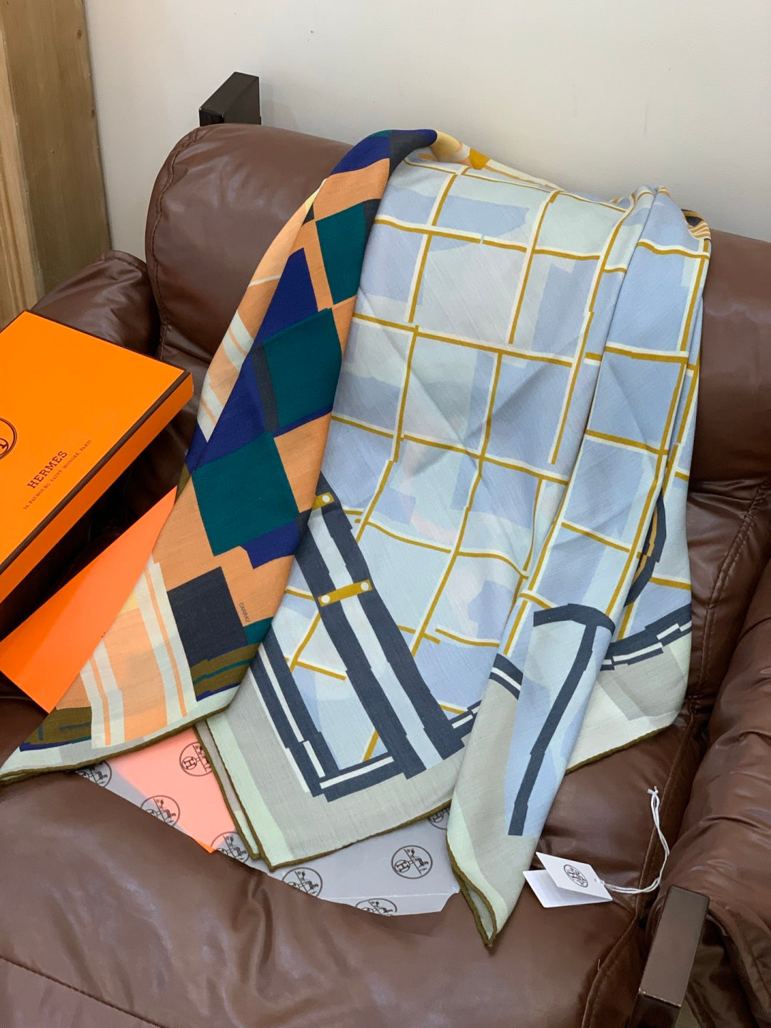 HM 25s Checkered Horse Scarf 140cm Blue Brown Cashmere Silk 970935