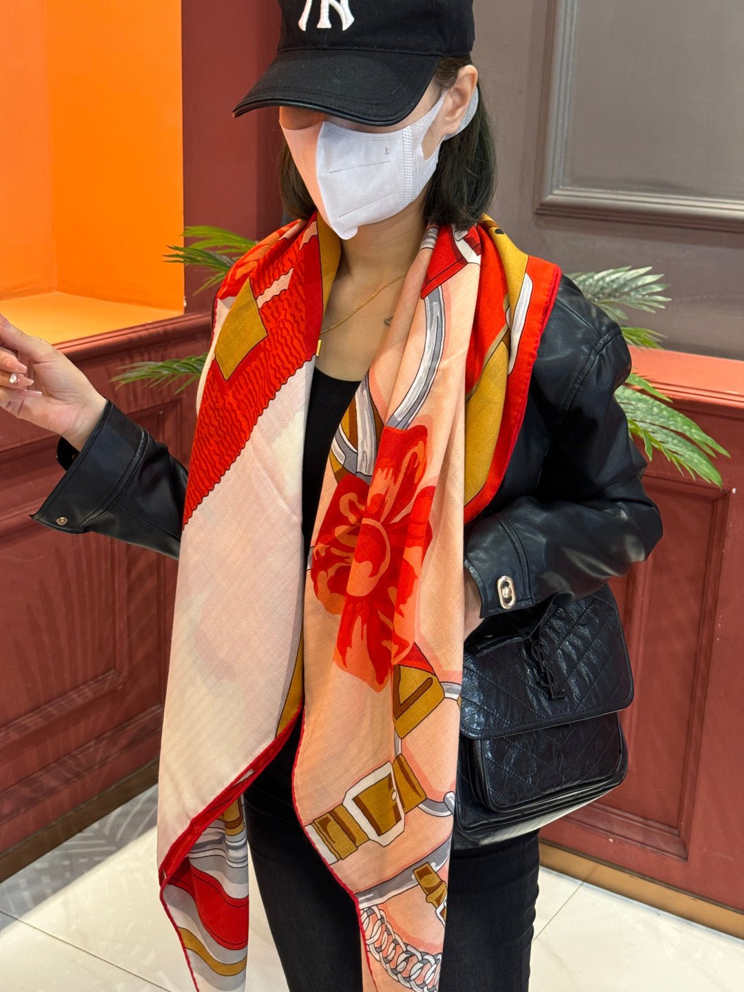 HM 25s Horse Reversible Scarf 140cm Orange Beige Cashmere Silk 967378