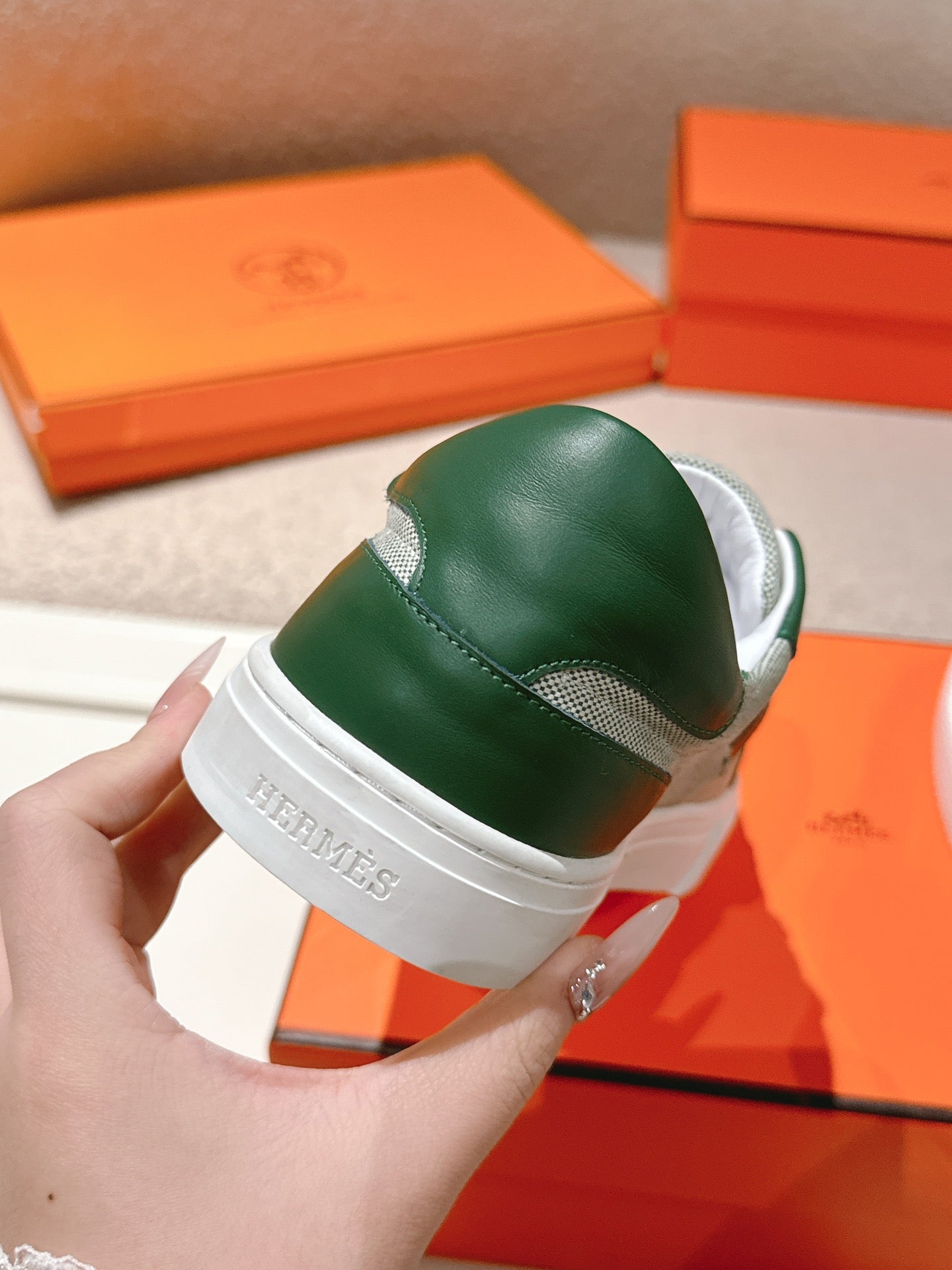 HM 25ss Kelly Buckle Sneakers Green Gray Cowhide Canvas 577492