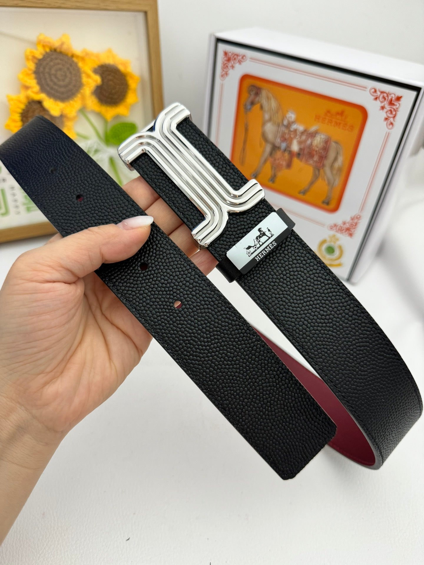 HM Belt 38mm Black Red Cowhide Leather Sliver Buckle 619013