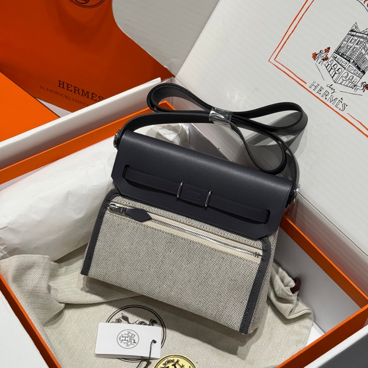 HM Mini Herbag Silver Buckle 20 Beige Grey Canvas and Hunter Cowhide 243290