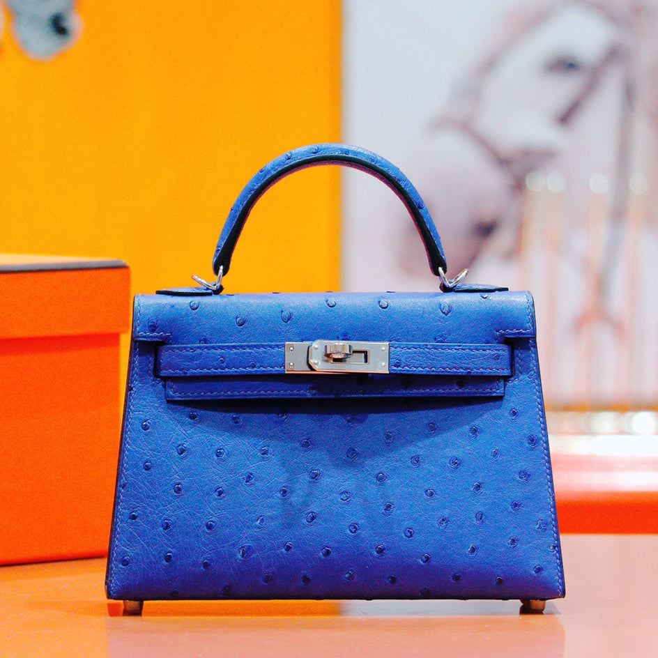 HM Mini Kelly 19cm Greek Blue Ostrich Silver Hardware