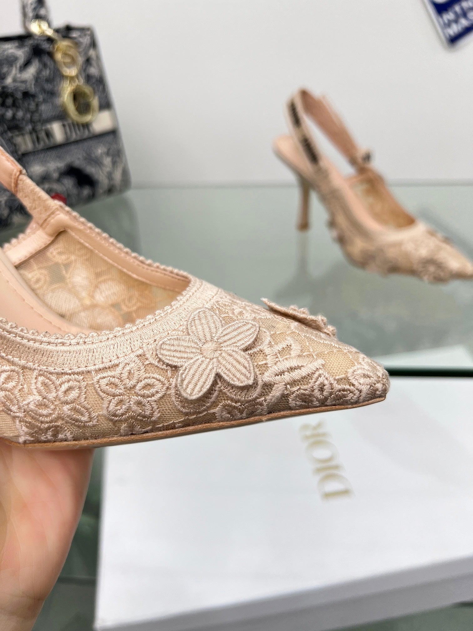 J'Adior Slingback Pump 95mm In Beige Floral Embroidered Lace Fabric 100842