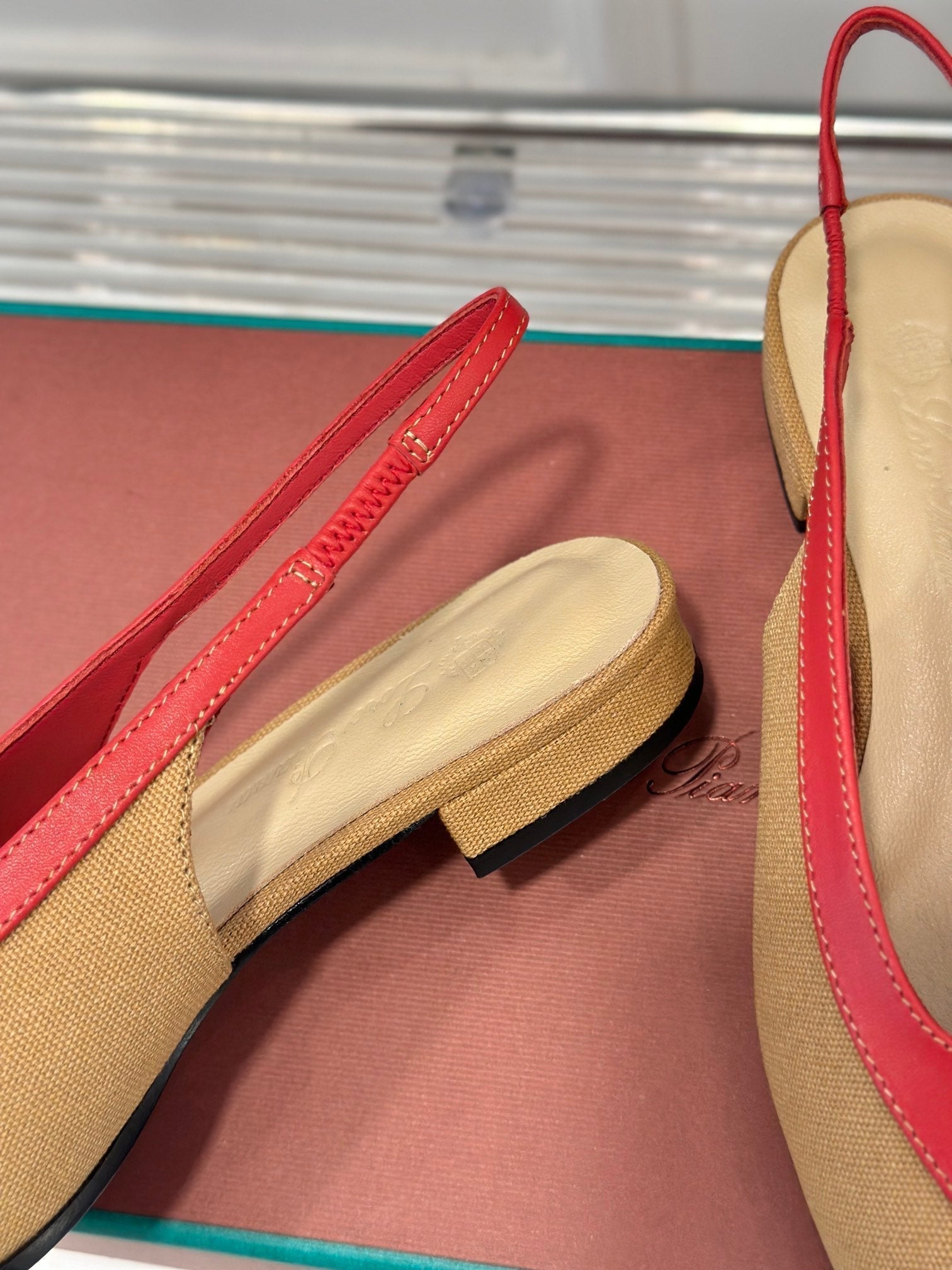 LP Rebecca Slingbacks In Mustard Brown Mix Red Cotton Fabric And Lambskin 989414