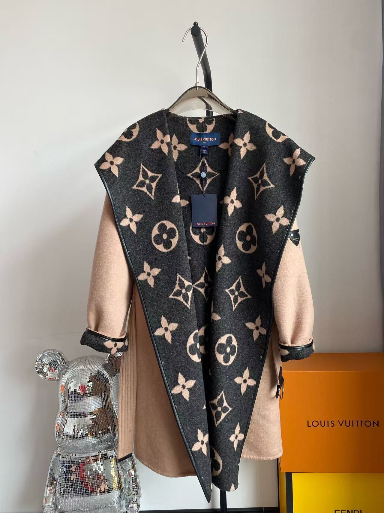 LV 2025 Reversible Signature Hooded Wrap Coat Beige Black Wool Cashmere