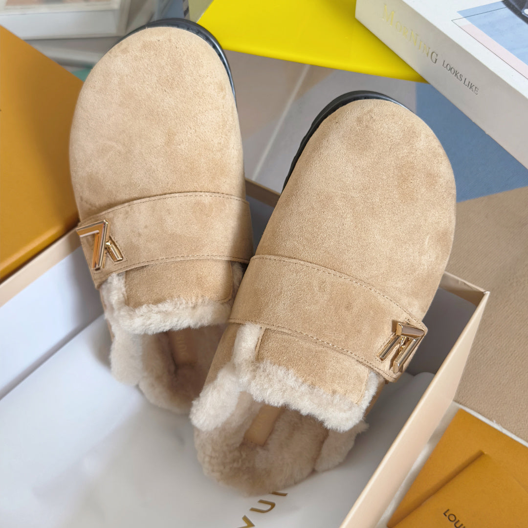 LV 25 Birkenstock Platform Slippers Light Beige Suede Wool 576218