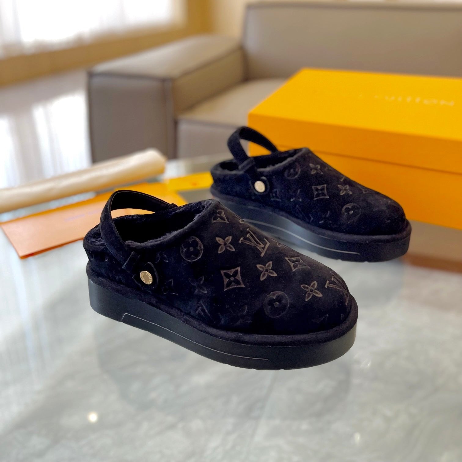 LV Aspen Platform Clog Black Monogram Suede