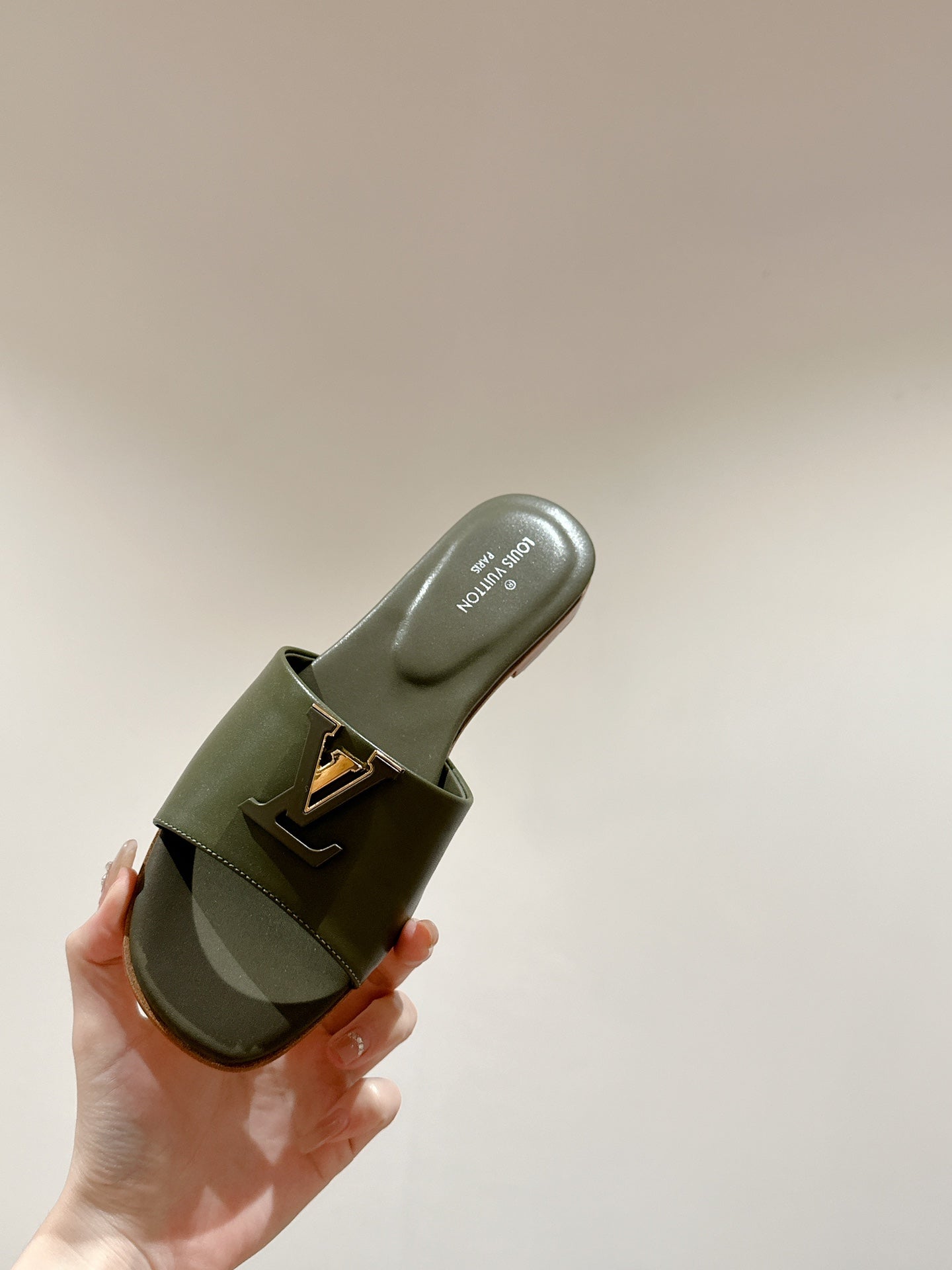 lv capri flat mule khaki green calfskin
