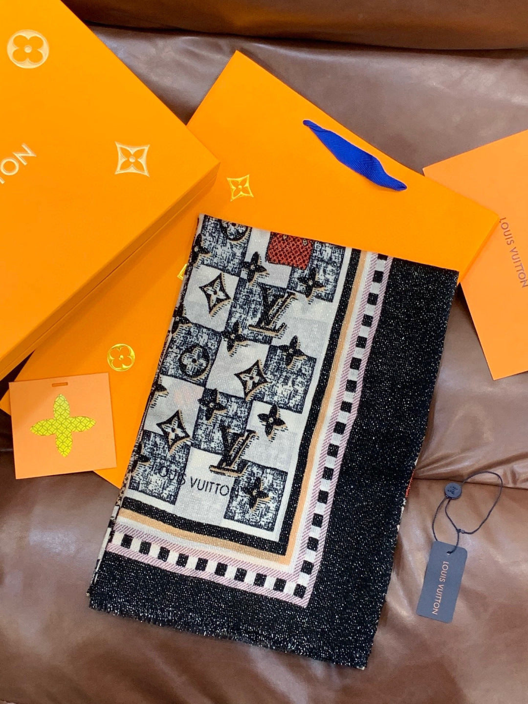 LV Monogram Scarf 200cm Black White Cashmere 969186