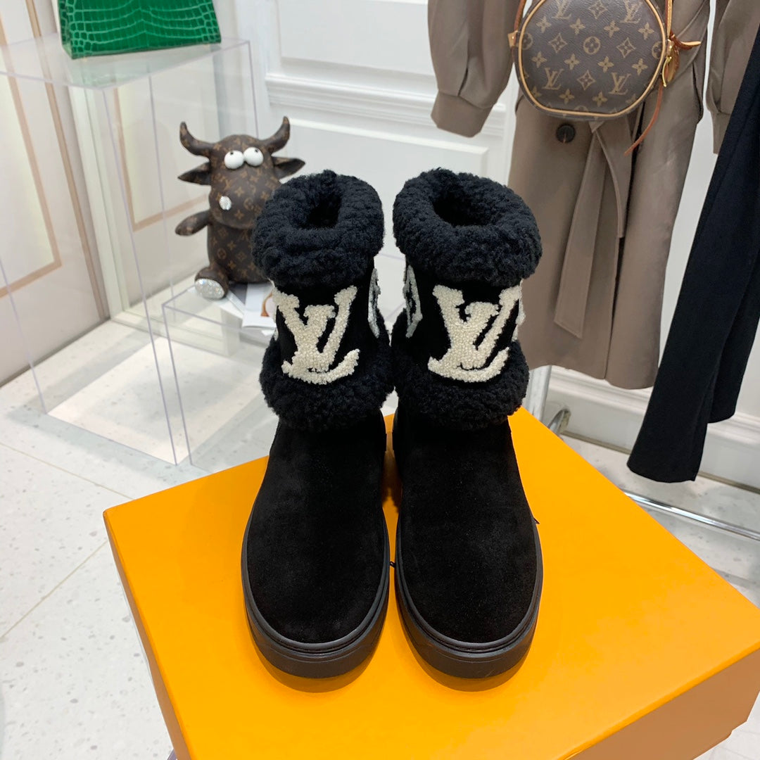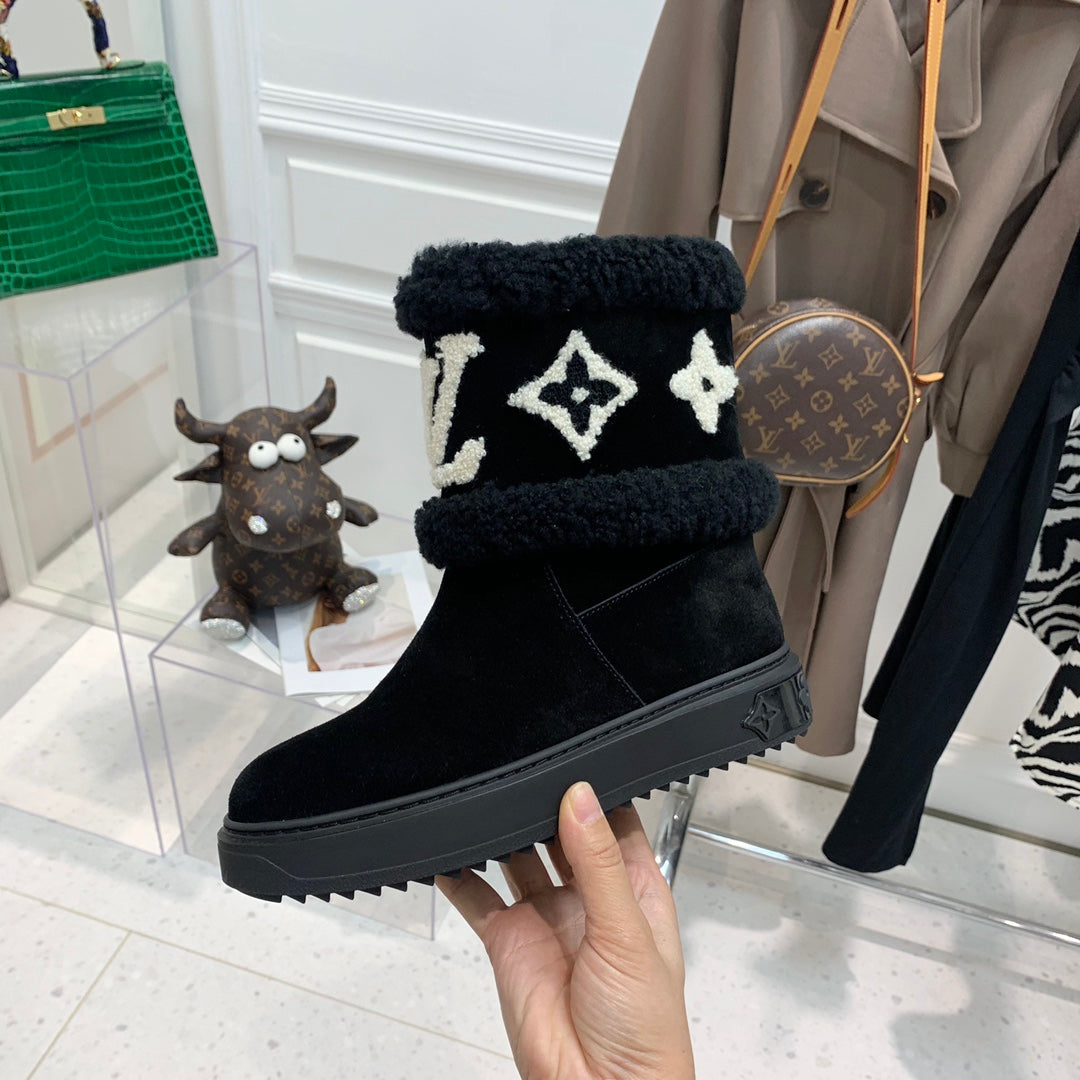 LV Snowdrop Flat Ankle Boot Black Monogram White Suede
