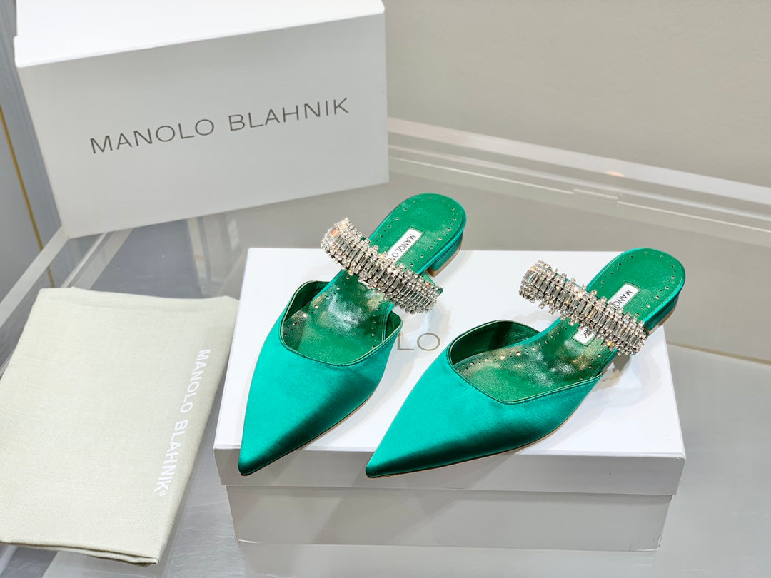 Manolo Flats Mules Diamond Buckle Green Silk Satin 327484
