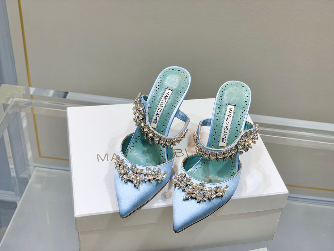 Manolo Mules Crystal Blue Silk Satin 219380