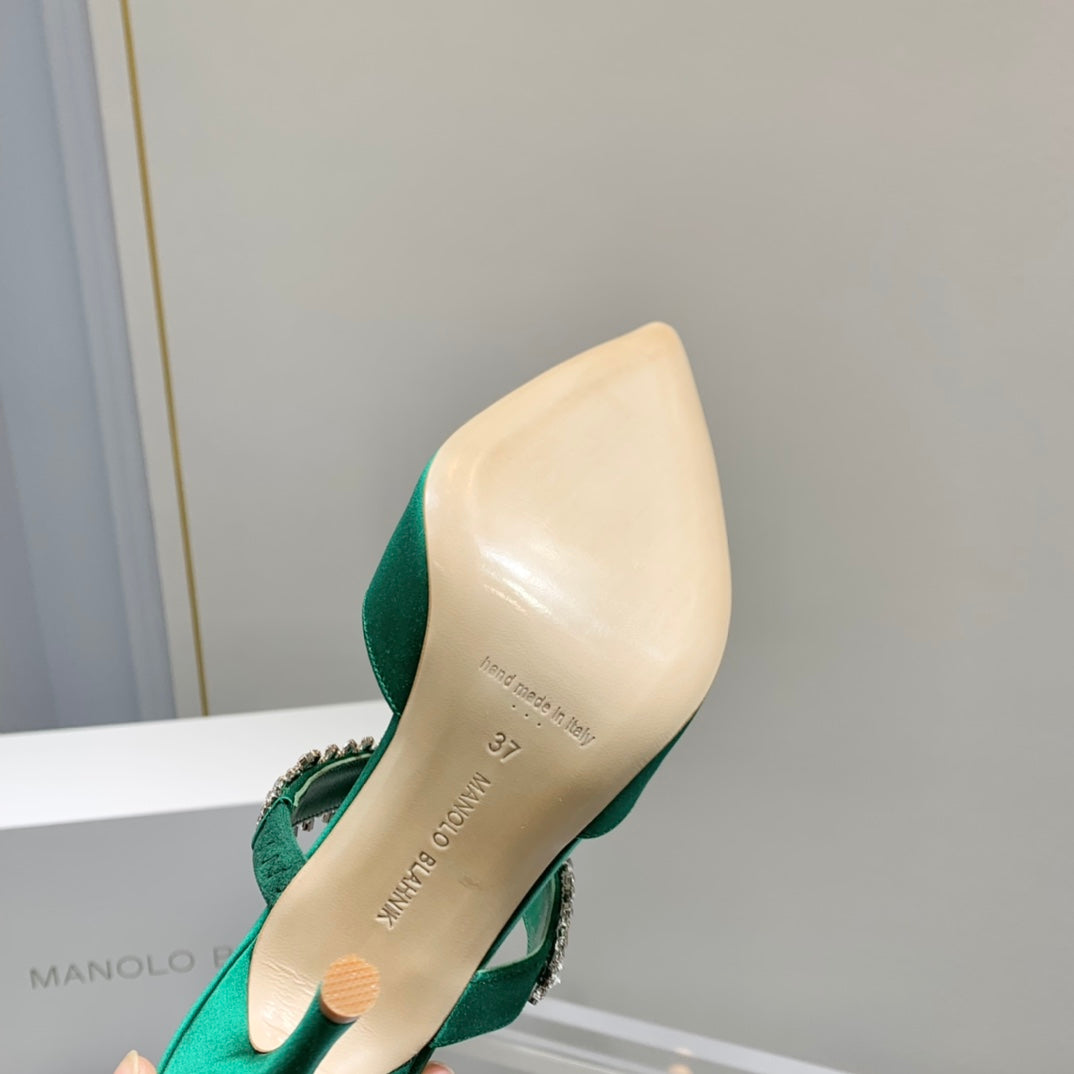 Manolo Mules Diamond Buckle Green Silk Satin 218813