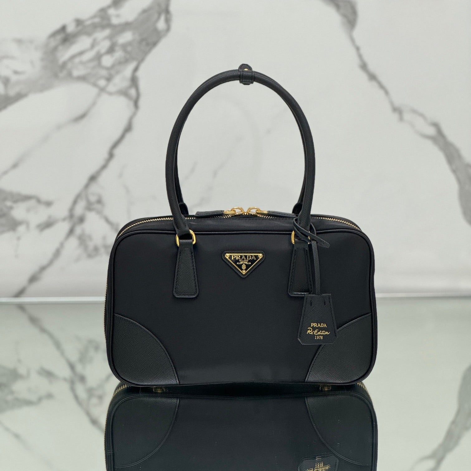 MEDIUM TOP HANDLE BAG 30 IN BLACK NYLON AND CALFSKIN TRIM