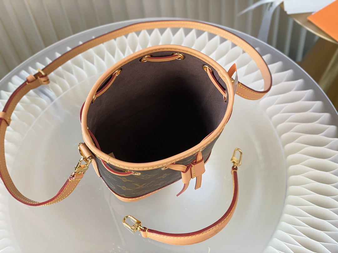 nano noe 13 brown monogram canvas beige calfskin gold hardware