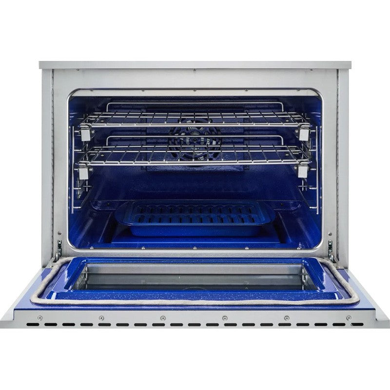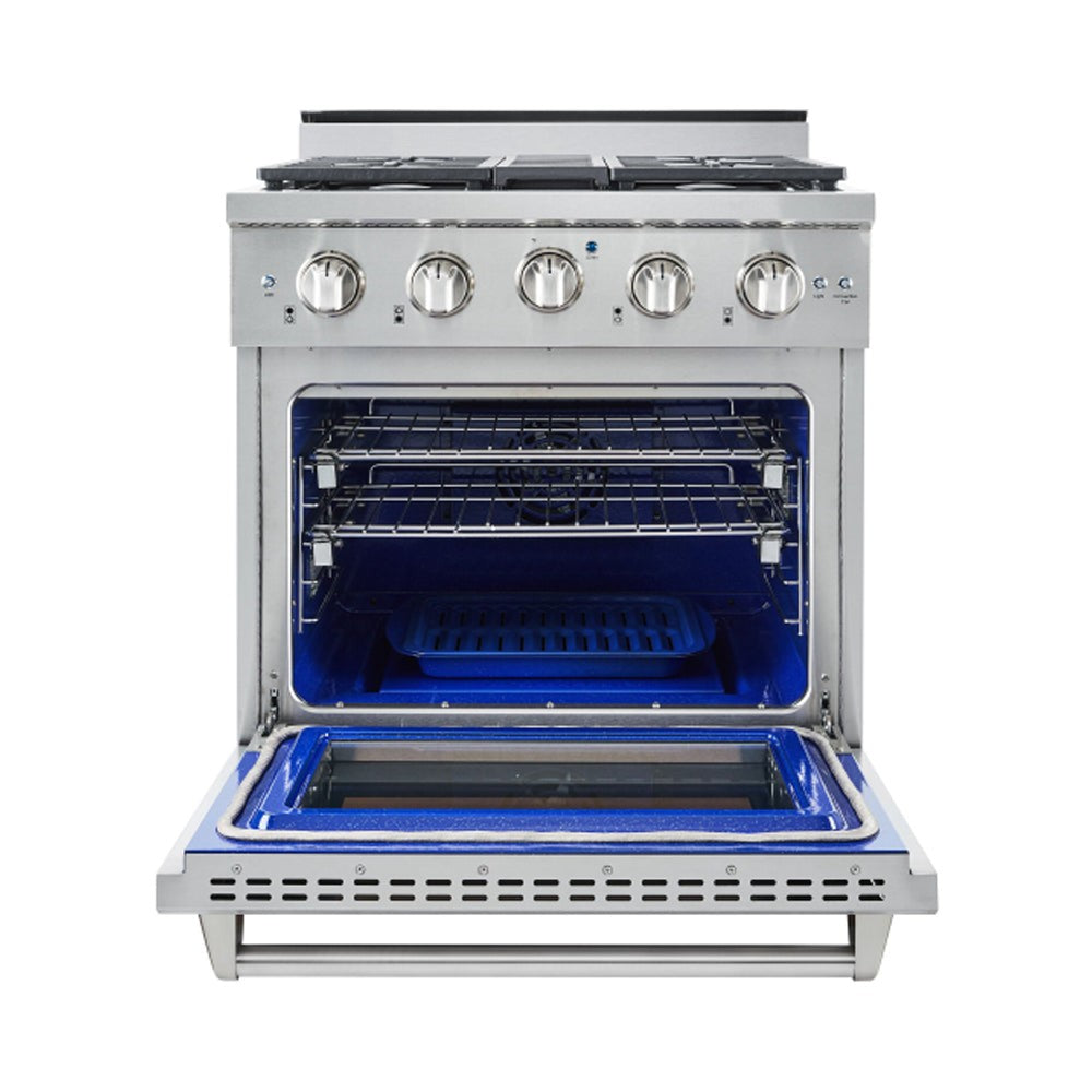 It is constructed with industrial anti-rust resistant stainless steel, making the stainless steel gas stove suitable for any home. All gas stove burners feature a black porcelain drip tray, flat continuous cast iron grates, and the versatility of both high power and ultra-low simmer. The convection oven features even cooking results in less time with a powerful infrared broiler, extra-smooth adjustable gliding racks, and a beautiful blue porcelain interior for easy cleaning. The NXR Culinary Series Gas Range comes with four permanently sealed burners that can handle any surface cooking.