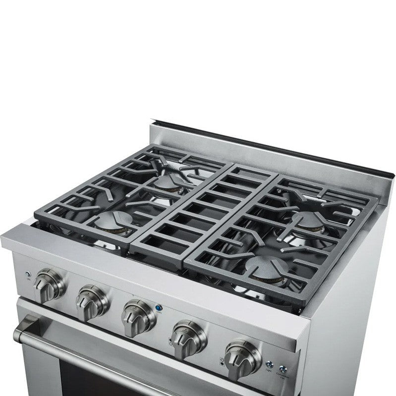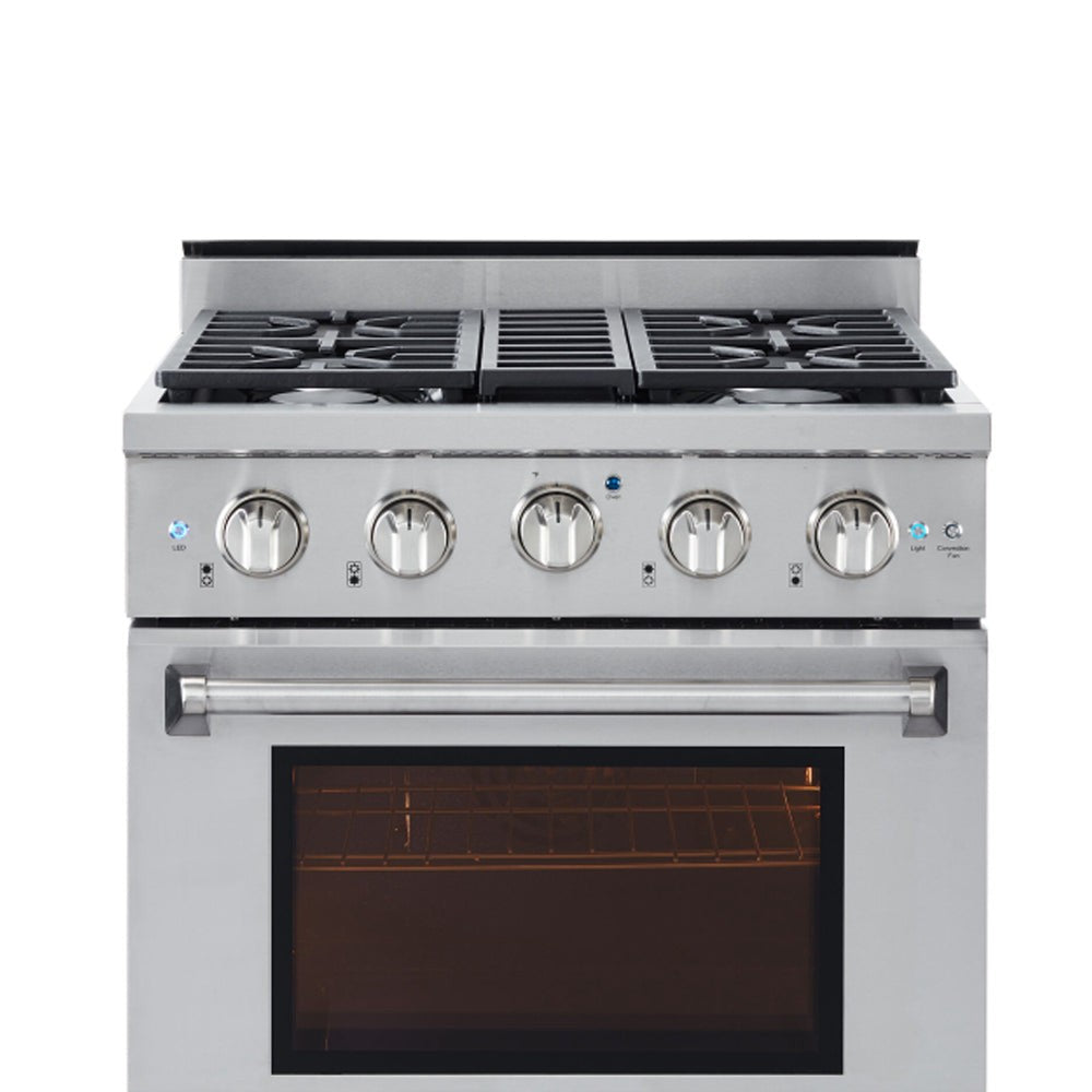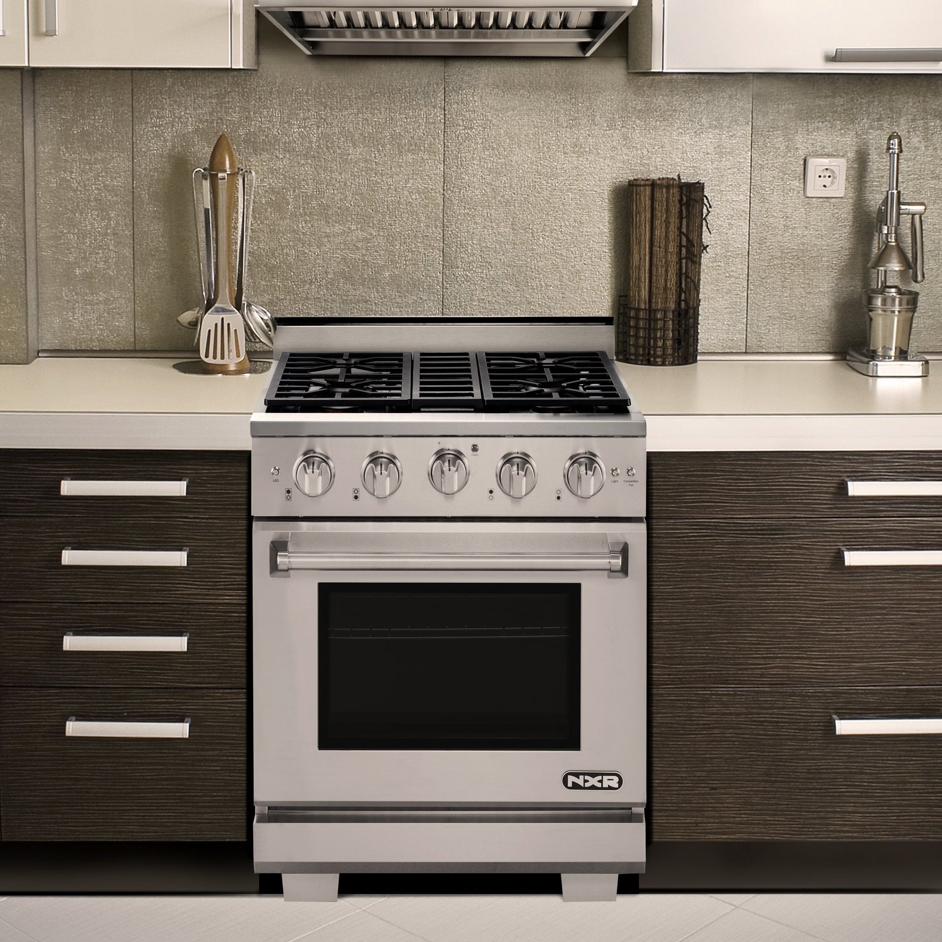 Designed to be the centerpiece of your kitchen, the NXR Culinary Series Gas Range stainless steel 30-inch professional style gas range features four German dual power burners, totaling 54,000 BTUs, over a convection oven. The gas stove is a German handcrafted burner, one of the highest quality on the market that's imported. The 30-inch gas range allows you to professionally cook and bake in the comfort of your kitchen. It cooks your meal faster than the average double oven gas range.