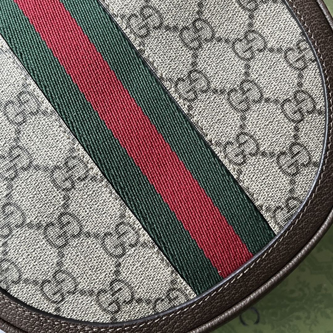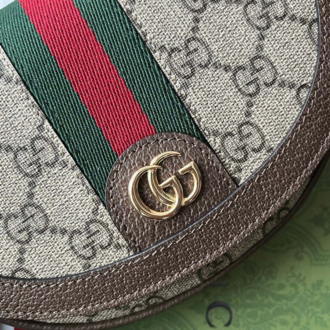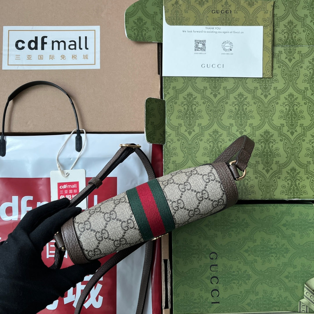 OPHIDIA MINI SHOULDER BAG 20 WITH WEB IN BEIGE EBONY CANVAS MIX BROWN CALFSKIN