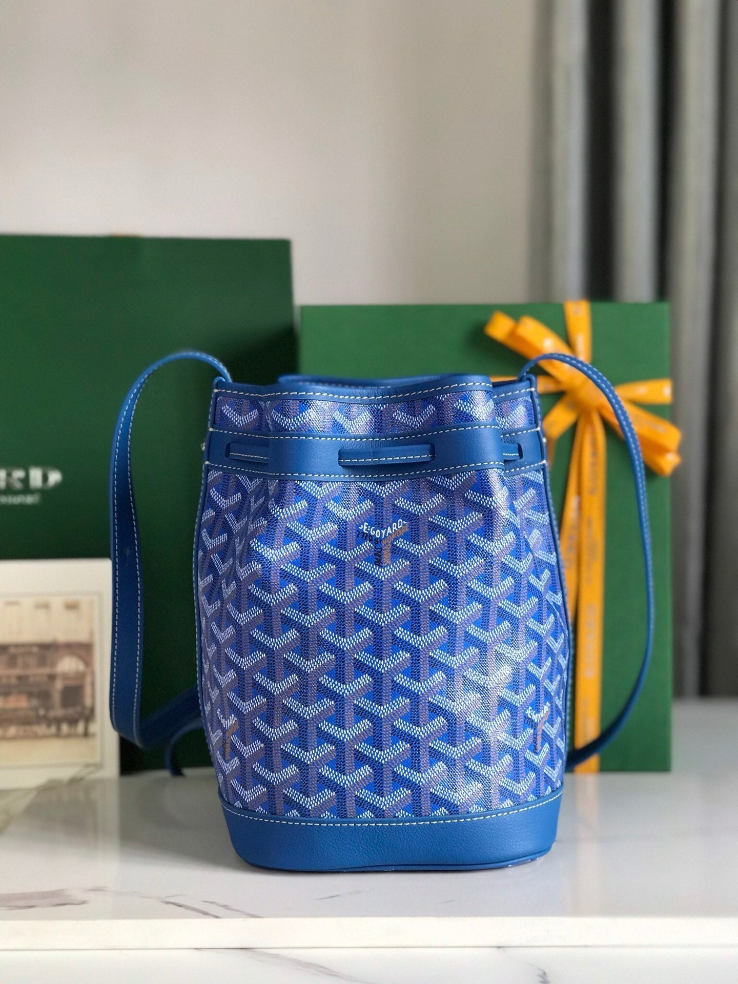 PETIT FLOT BUCKET BAG 22 IN SAPPHIRE BLUE GOYARDINE CANVAS AND LAMBSKIN TRIM