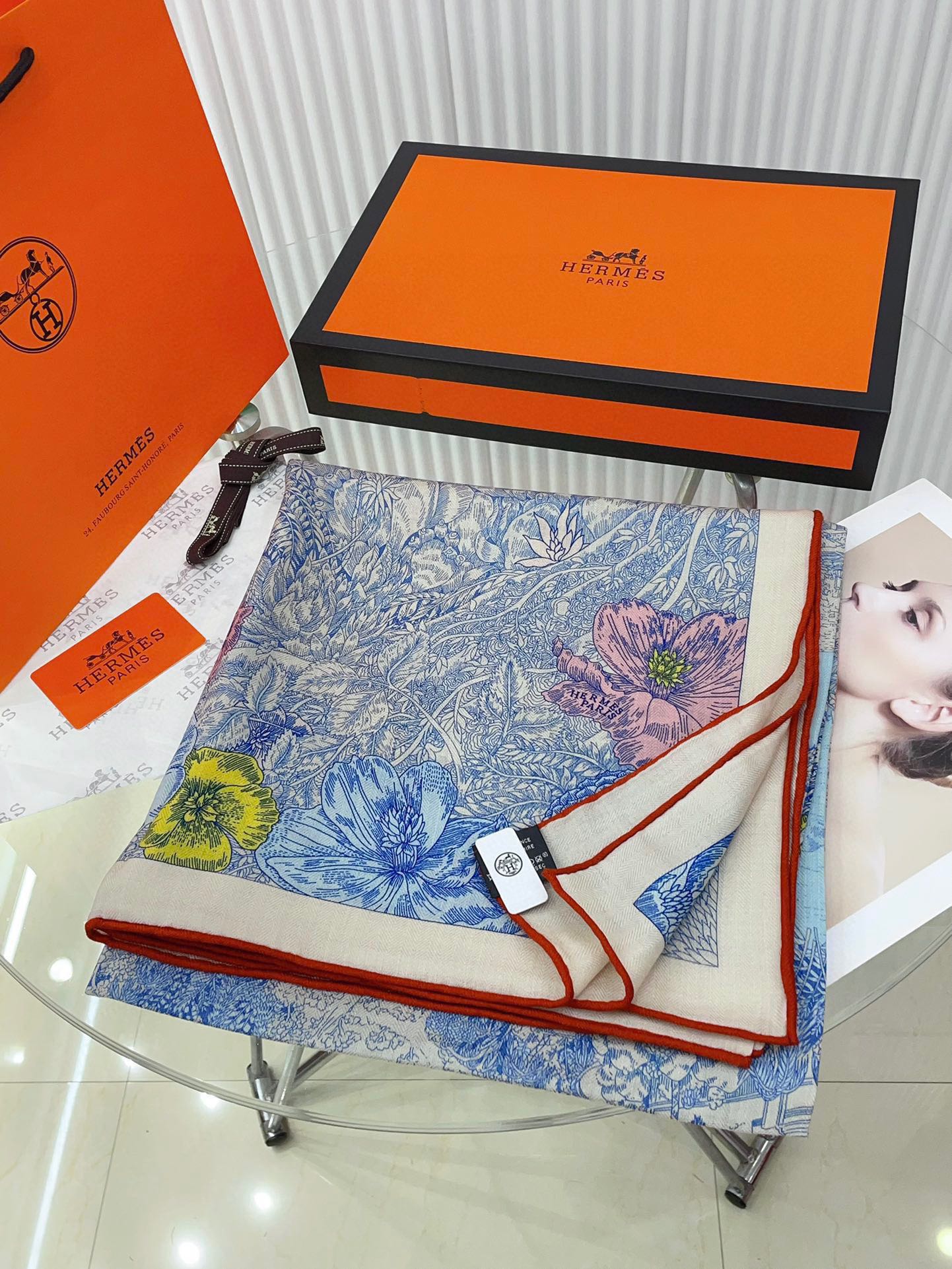 Retour A La Nature Shawl 140CM In Dakr Blue Colorful Cashmere And Silk