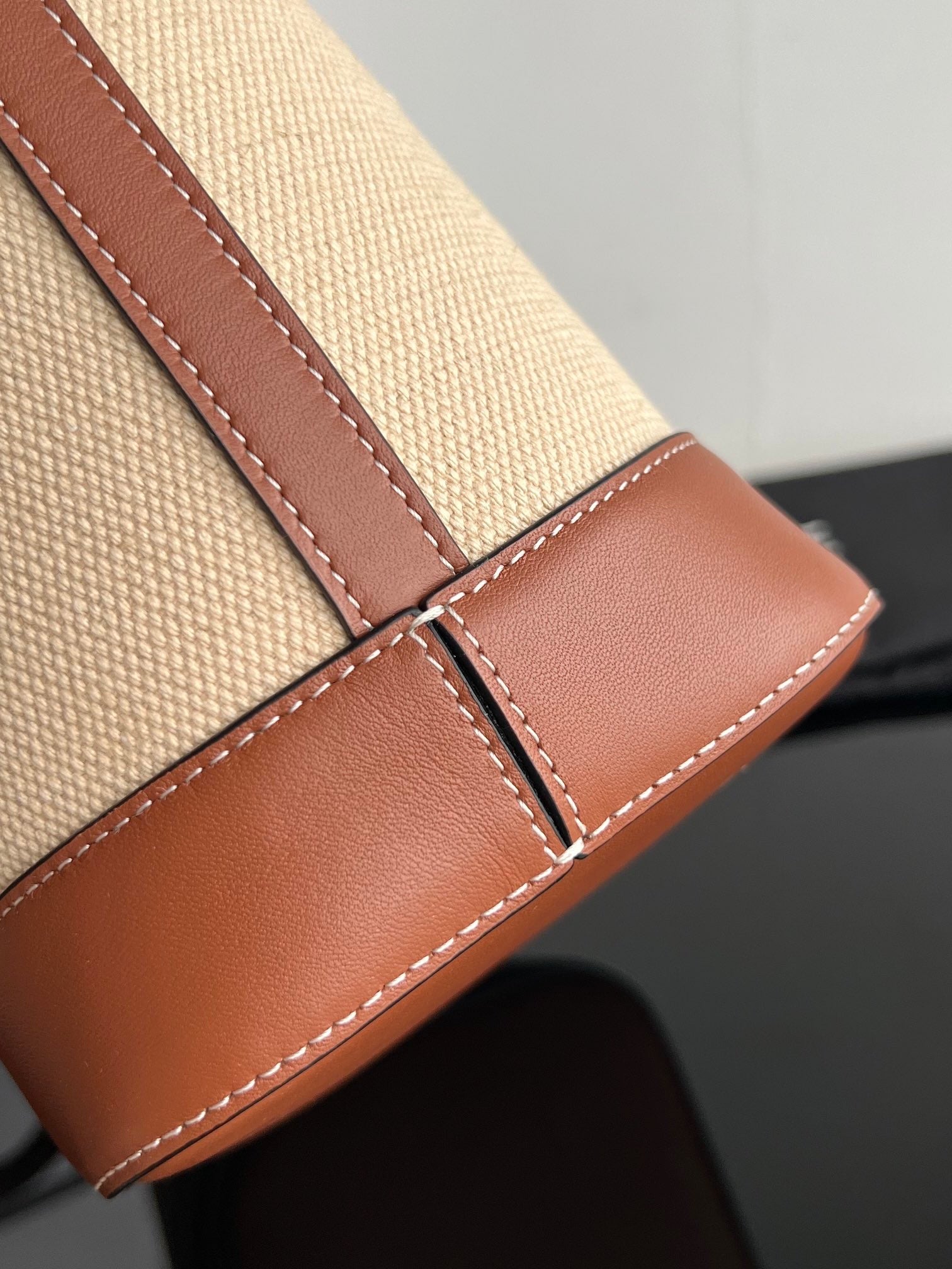 SMALL BUCKET CUIR TRIOMPHE 24CM IN STRIPED TEXTILE AND TAN CALFSKIN