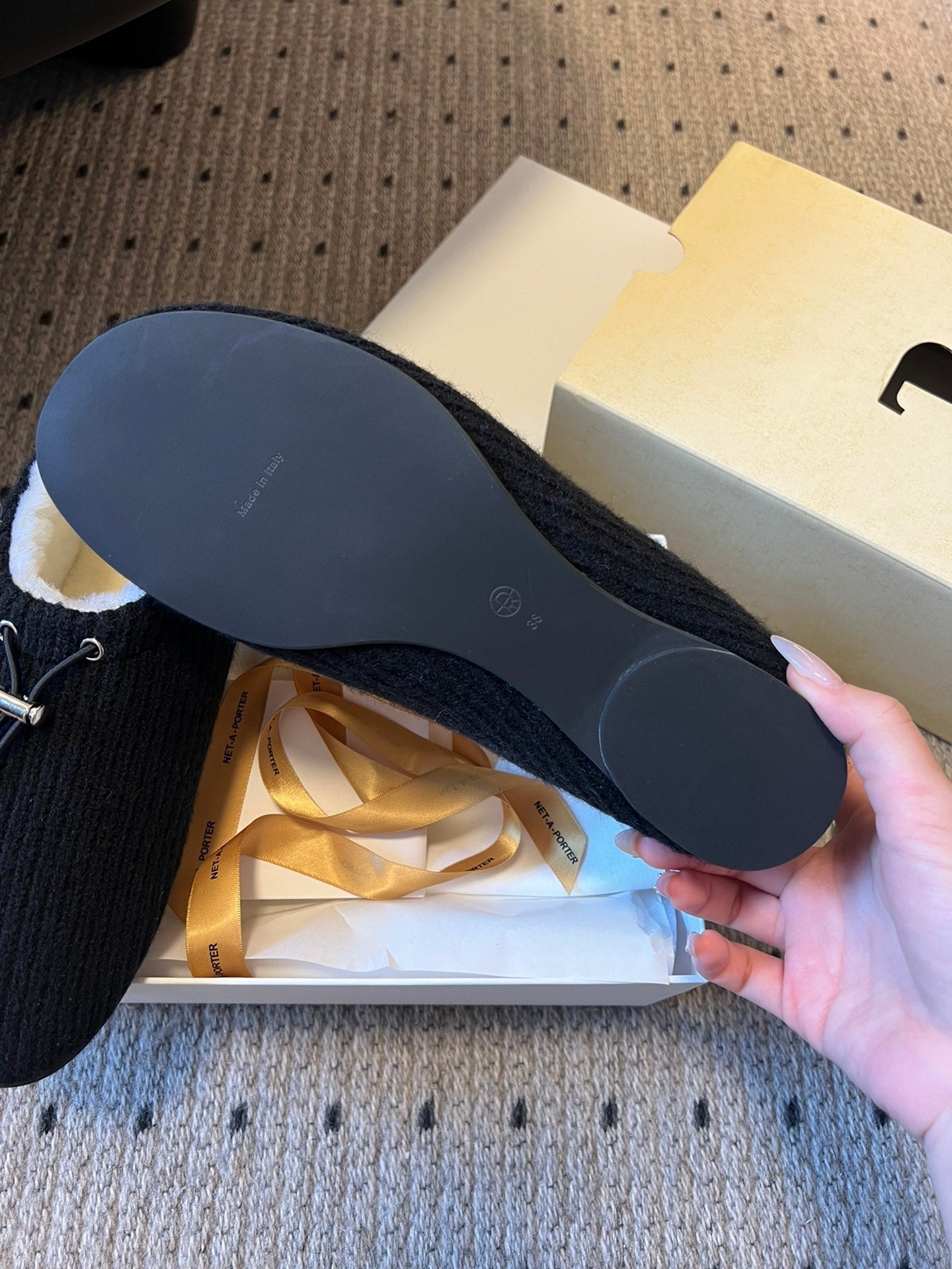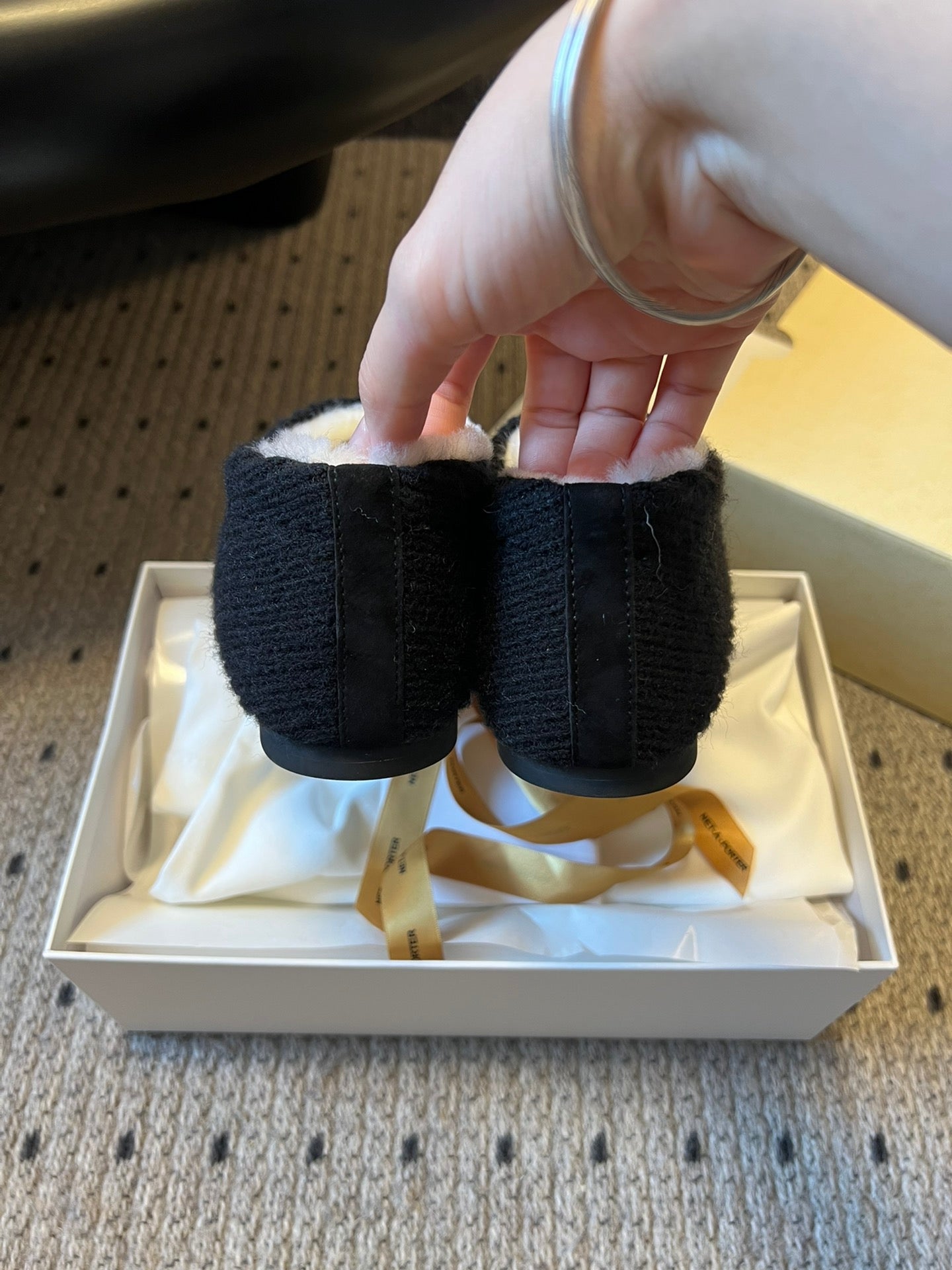 The Row 2025 Striped Furry Slipper Black White Wool 561636
