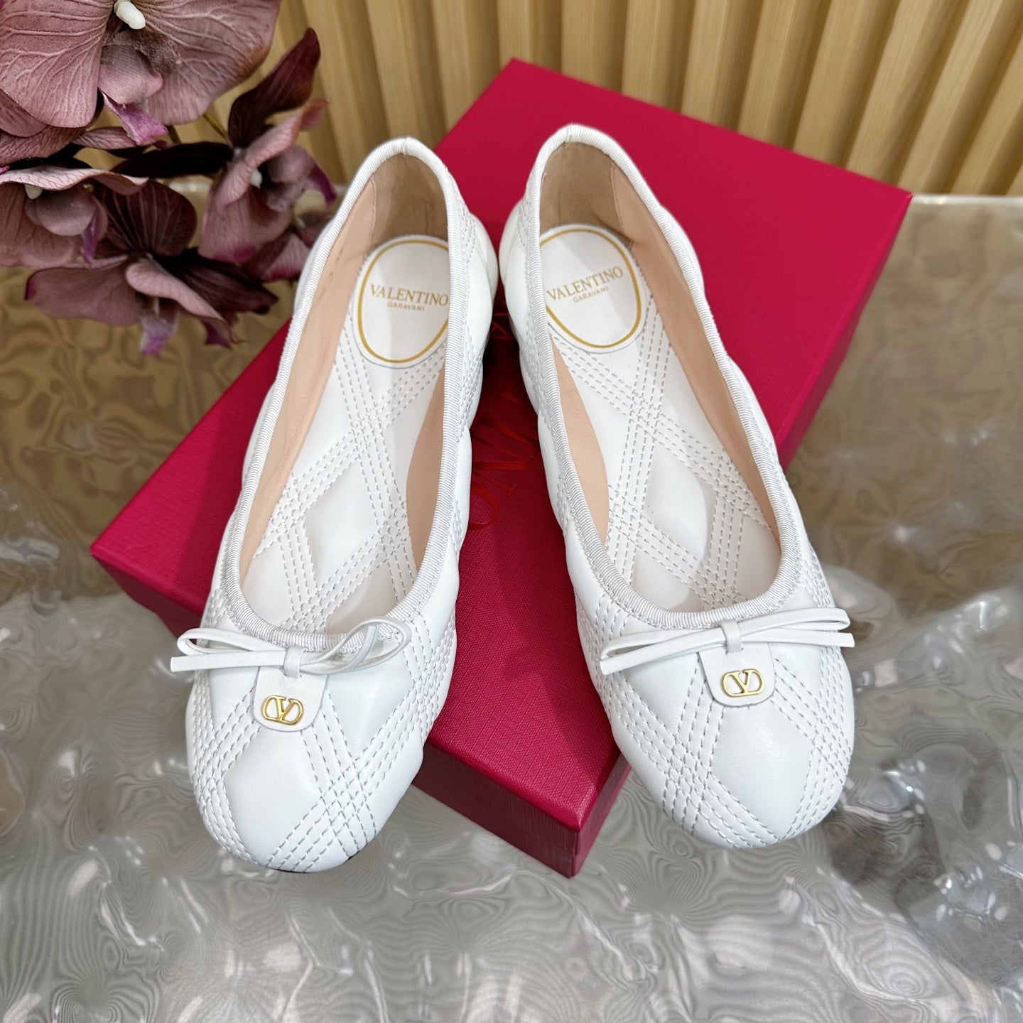 VT 2025 Quilted Leather Bow Ballerina Flats White Sheepskin 286491